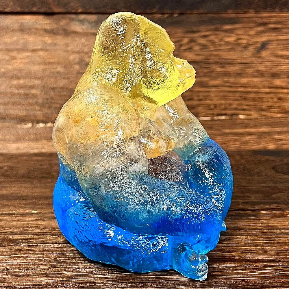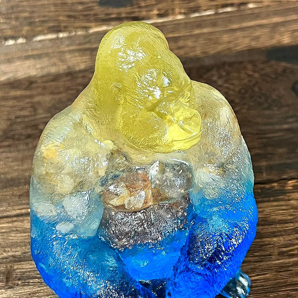 力強くもどこか愛らしい佇まいのゴリラをモチーフにした、ビッグサイズのゴリラのオルゴナイトです。イエローとブルーのコントラストが美しく、天然石は、輝く金色の針を持つルチルクォーツと、太陽のような明るさを持つシトリンを閉じ込めました。