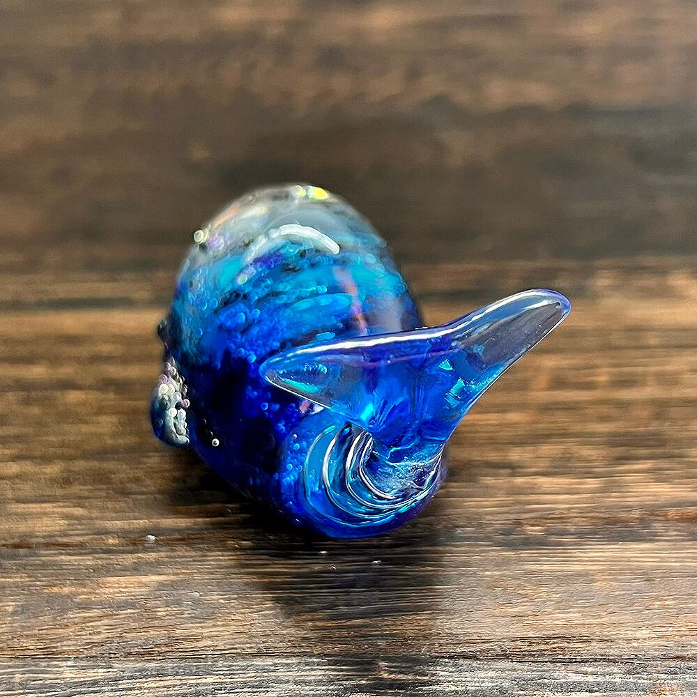 一点一点、天然石の配置やレジンに閉じ込めた素材などが異なり、世界に一つだけの作品です。深海の神秘を表現するため、青を基調としつつも、天然石の色や光によって様々な表情を見せます。まるで海中を泳ぐクジラが、その時々で違う表情を見せてくれるように。