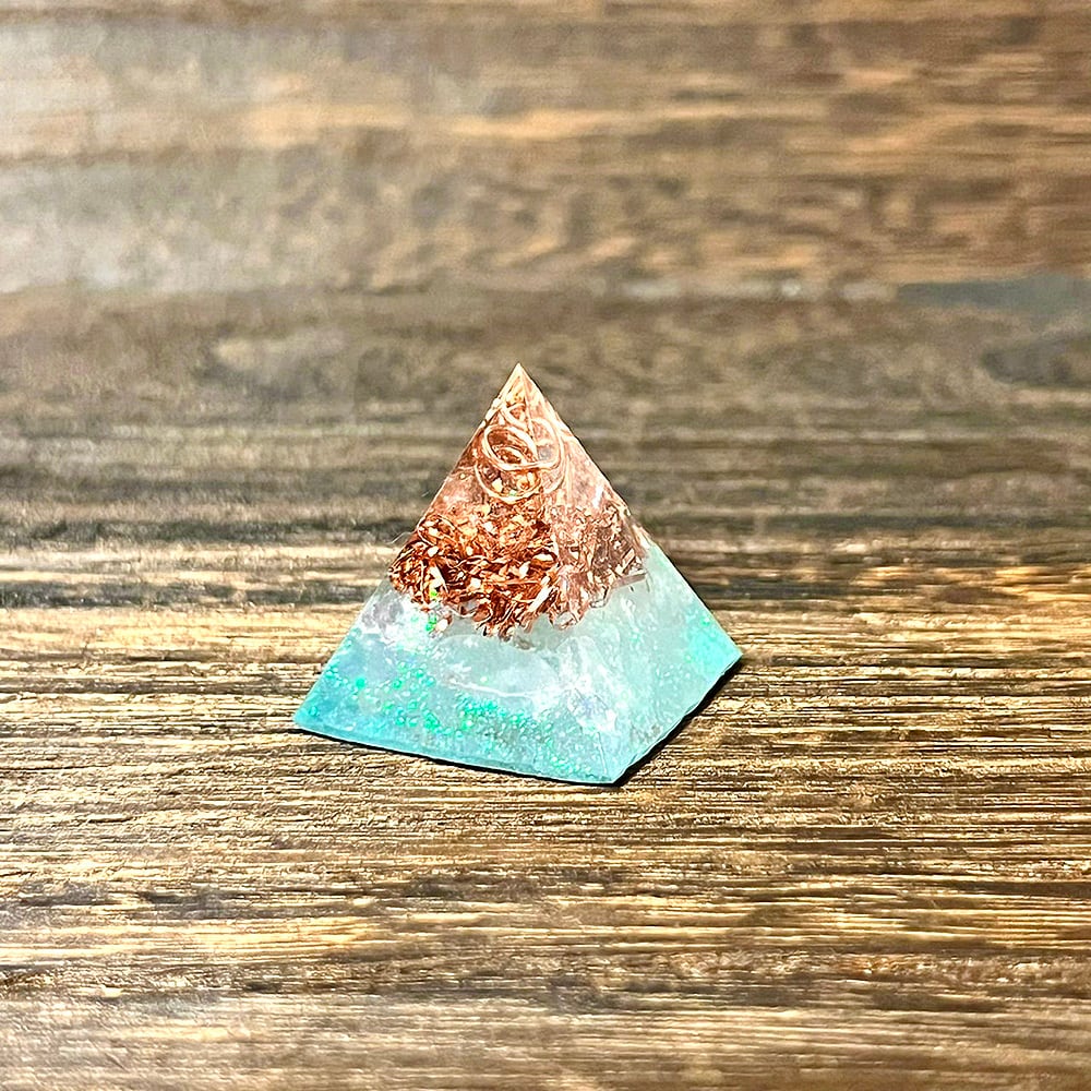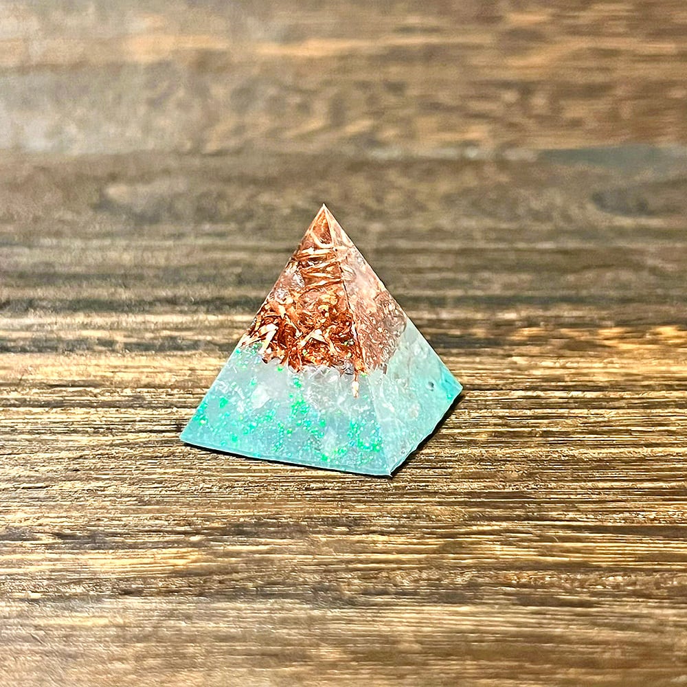 「天使の石」とも呼ばれ、高次元の存在や天使のエネルギーとつながりやすいとされていわれるセレスタイトを使用したミニピラミッド型オルゴナイトです。鏡面仕上げなので透明度が高く、見る角度によって屈折や反射による表情の違いが楽しめます。