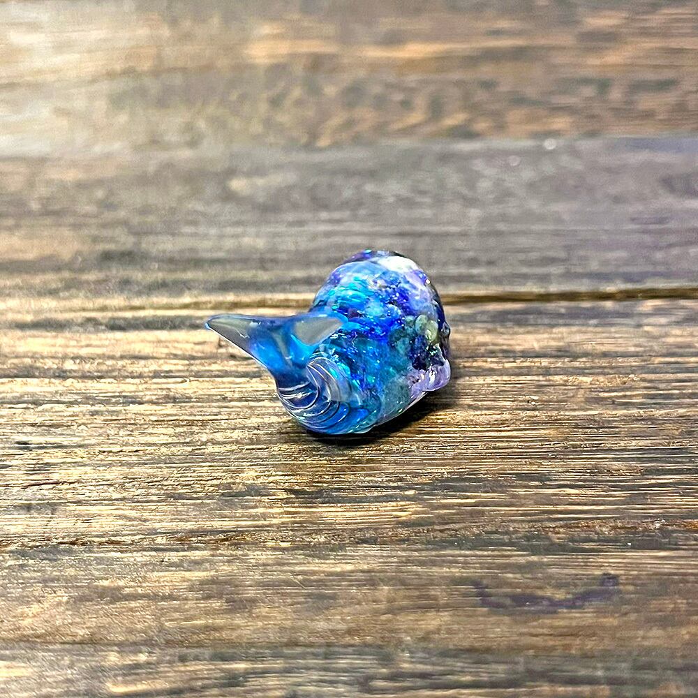 一点一点、天然石の配置やレジンに閉じ込めた素材などが異なり、世界に一つだけの作品です。深海の神秘を表現するため、青を基調としつつも、天然石の色や光によって様々な表情を見せます。まるで海中を泳ぐクジラが、その時々で違う表情を見せてくれるように。