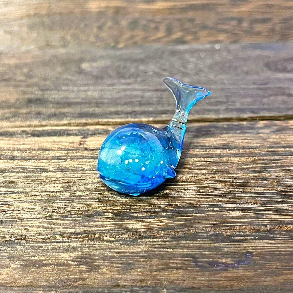 一点一点、天然石の配置やレジンに閉じ込めた素材などが異なり、世界に一つだけの作品です。深海の神秘を表現するため、青を基調としつつも、天然石の色や光によって様々な表情を見せます。まるで海中を泳ぐクジラが、その時々で違う表情を見せてくれるように。