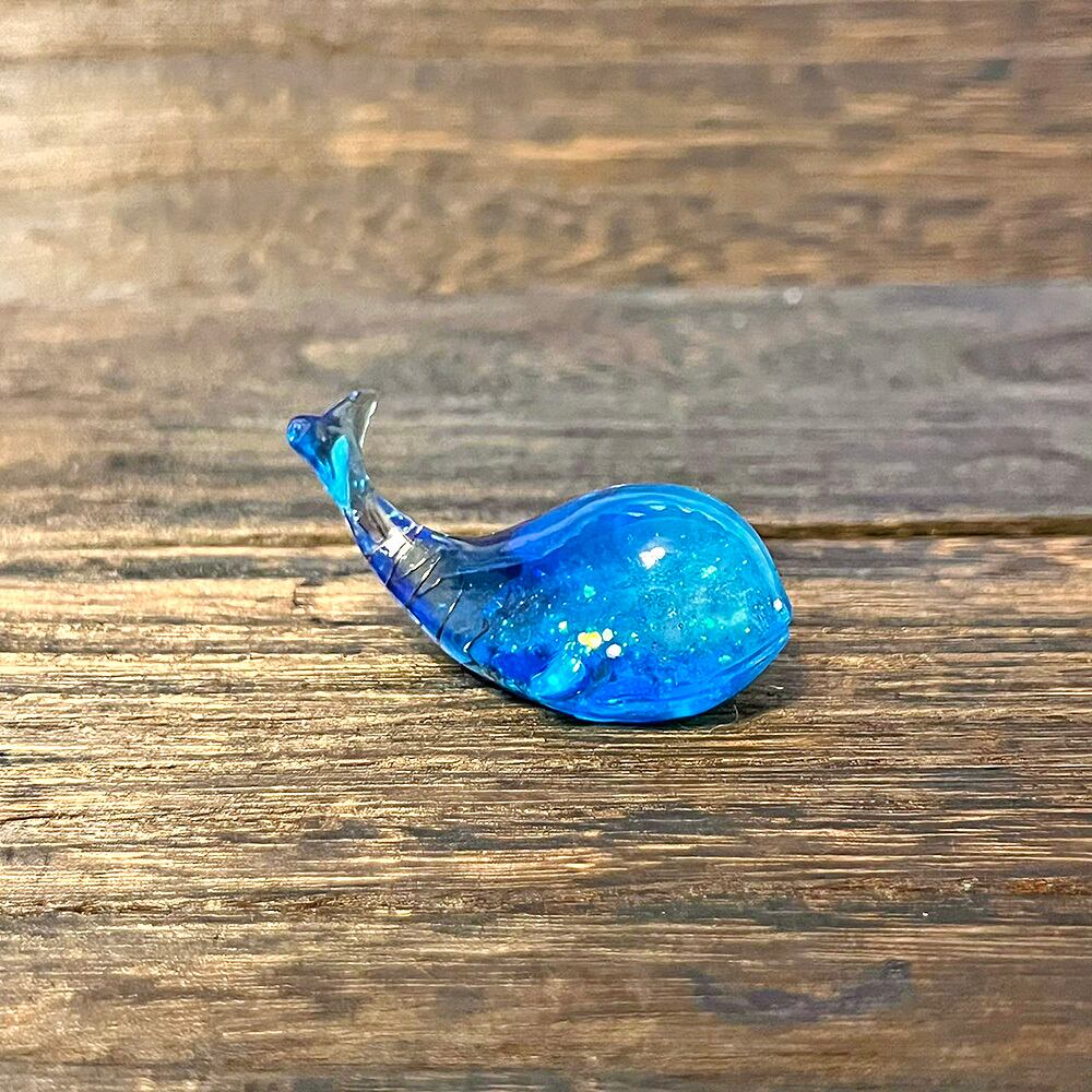 一点一点、天然石の配置やレジンに閉じ込めた素材などが異なり、世界に一つだけの作品です。深海の神秘を表現するため、青を基調としつつも、天然石の色や光によって様々な表情を見せます。まるで海中を泳ぐクジラが、その時々で違う表情を見せてくれるように。