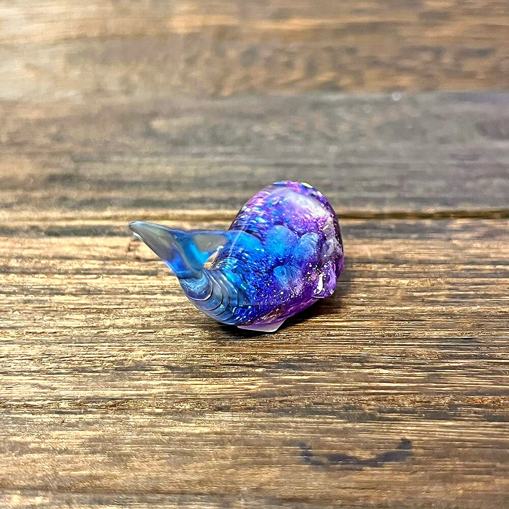 一点一点、天然石の配置やレジンに閉じ込めた素材などが異なり、世界に一つだけの作品です。深海の神秘を表現するため、青を基調としつつも、天然石の色や光によって様々な表情を見せます。まるで海中を泳ぐクジラが、その時々で違う表情を見せてくれるように。