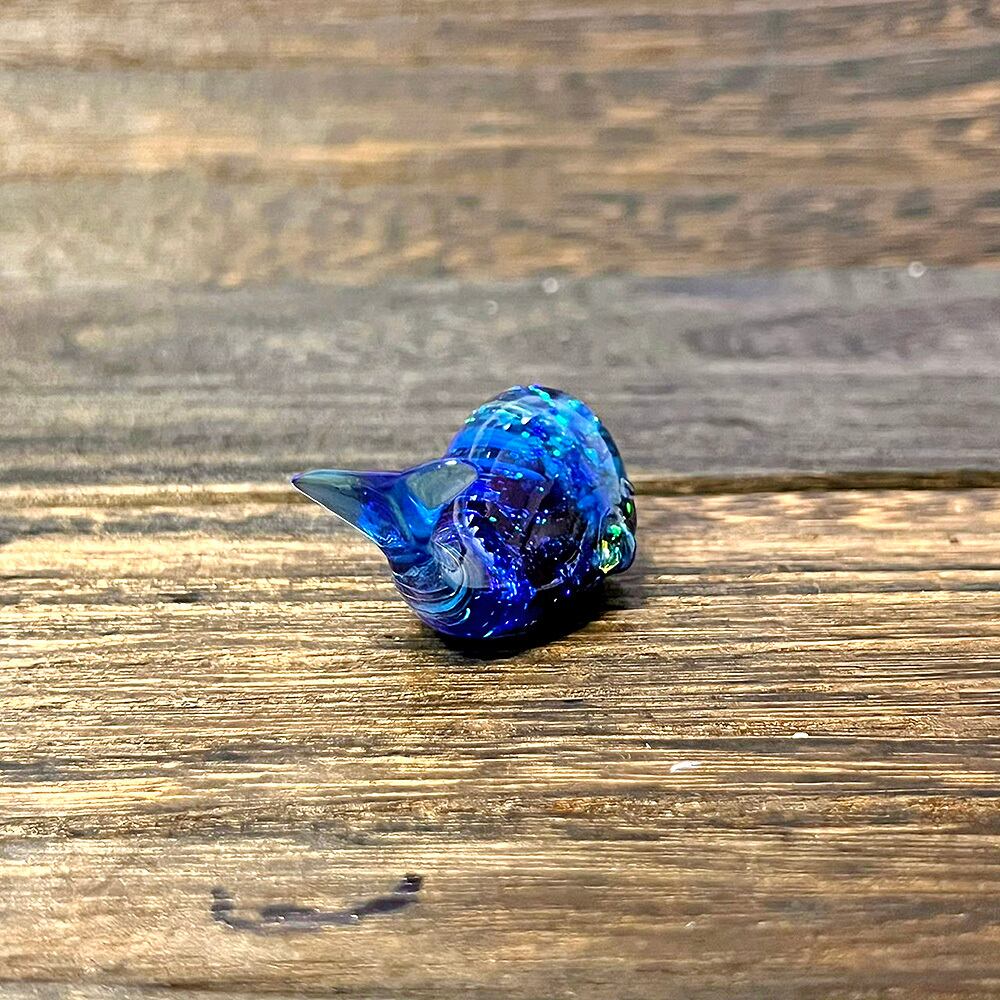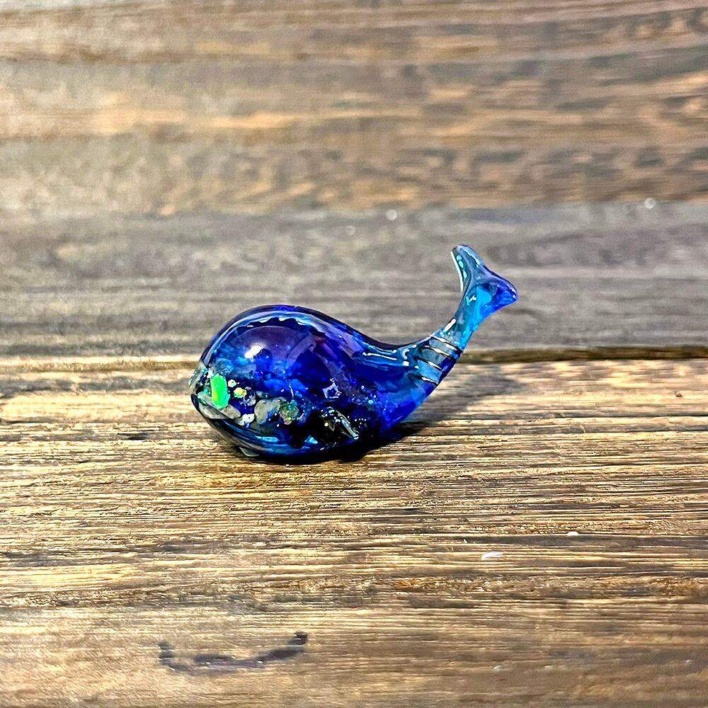 一点一点、天然石の配置やレジンに閉じ込めた素材などが異なり、世界に一つだけの作品です。深海の神秘を表現するため、青を基調としつつも、天然石の色や光によって様々な表情を見せます。まるで海中を泳ぐクジラが、その時々で違う表情を見せてくれるように。