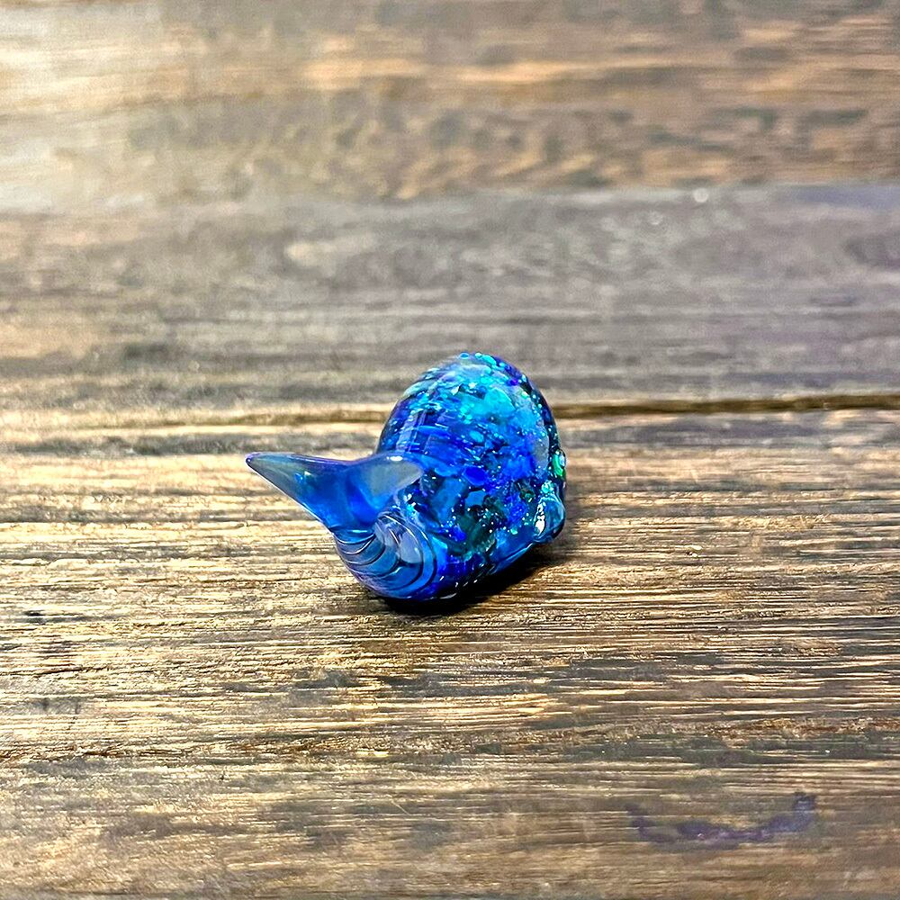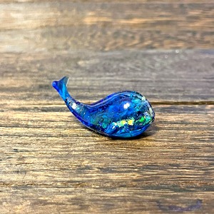 一点一点、天然石の配置やレジンに閉じ込めた素材などが異なり、世界に一つだけの作品です。深海の神秘を表現するため、青を基調としつつも、天然石の色や光によって様々な表情を見せます。まるで海中を泳ぐクジラが、その時々で違う表情を見せてくれるように。