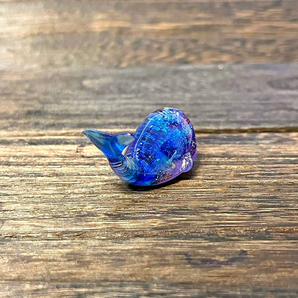 一点一点、天然石の配置やレジンに閉じ込めた素材などが異なり、世界に一つだけの作品です。深海の神秘を表現するため、青を基調としつつも、天然石の色や光によって様々な表情を見せます。まるで海中を泳ぐクジラが、その時々で違う表情を見せてくれるように。