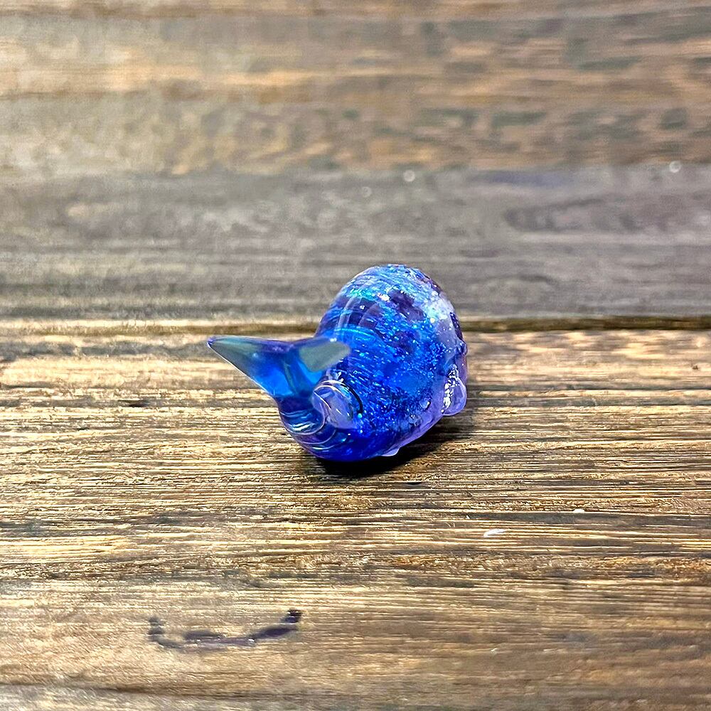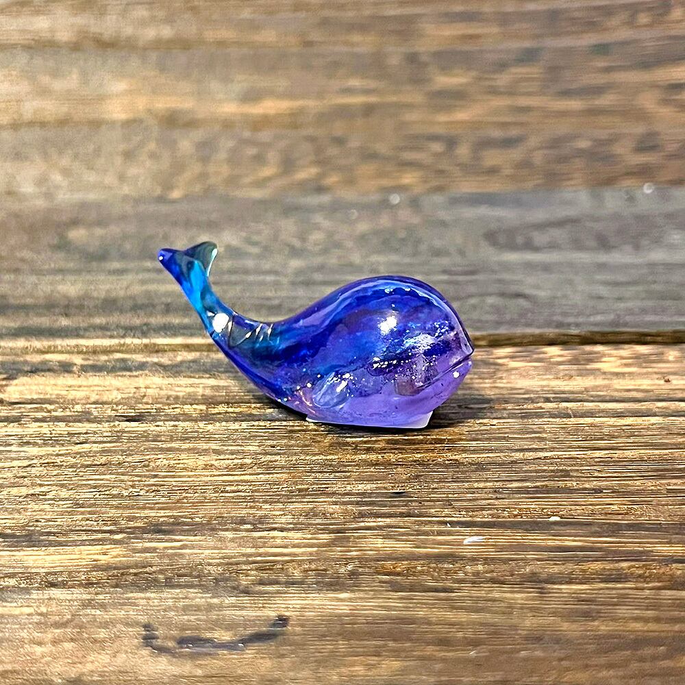 一点一点、天然石の配置やレジンに閉じ込めた素材などが異なり、世界に一つだけの作品です。深海の神秘を表現するため、青を基調としつつも、天然石の色や光によって様々な表情を見せます。まるで海中を泳ぐクジラが、その時々で違う表情を見せてくれるように。