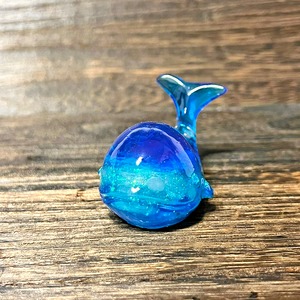 一点一点、天然石の配置やレジンに閉じ込めた素材などが異なり、世界に一つだけの作品です。深海の神秘を表現するため、青を基調としつつも、天然石の色や光によって様々な表情を見せます。まるで海中を泳ぐクジラが、その時々で違う表情を見せてくれるように。