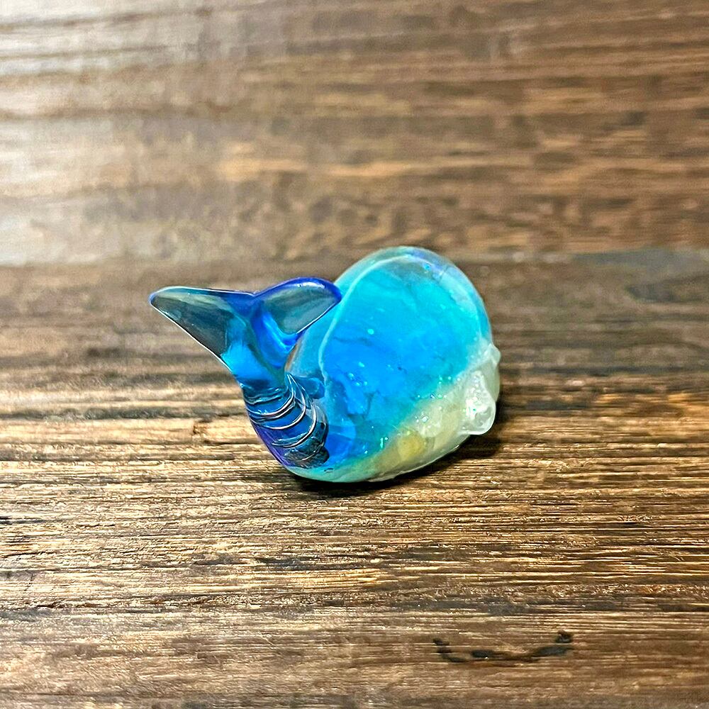 一点一点、天然石の配置やレジンに閉じ込めた素材などが異なり、世界に一つだけの作品です。深海の神秘を表現するため、青を基調としつつも、天然石の色や光によって様々な表情を見せます。まるで海中を泳ぐクジラが、その時々で違う表情を見せてくれるように。