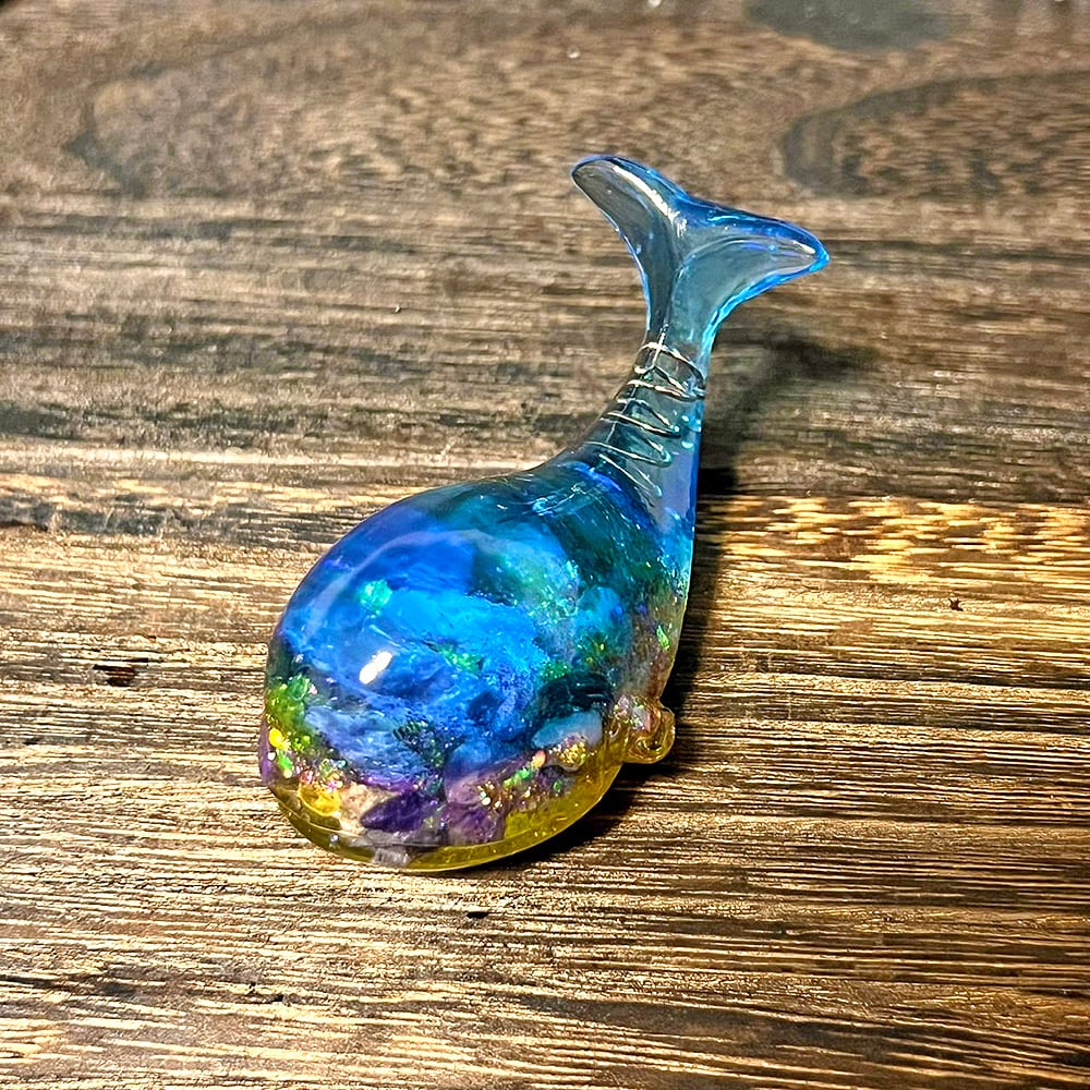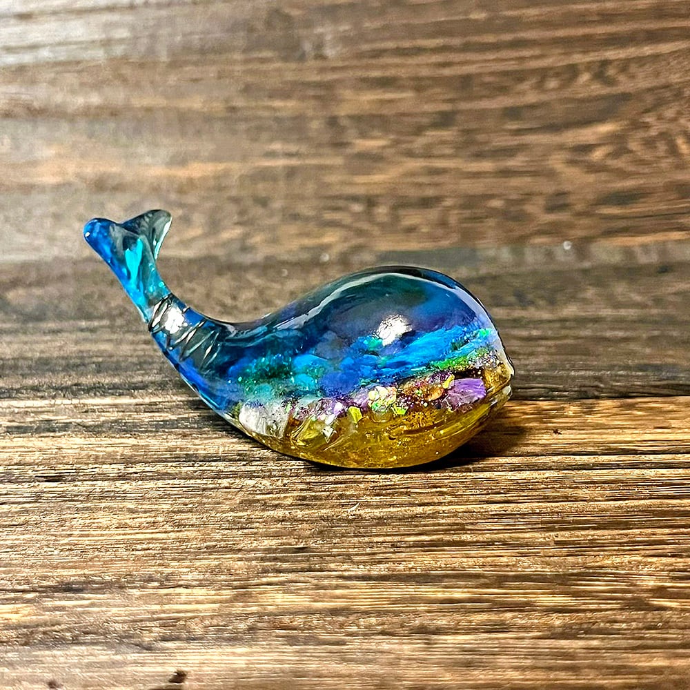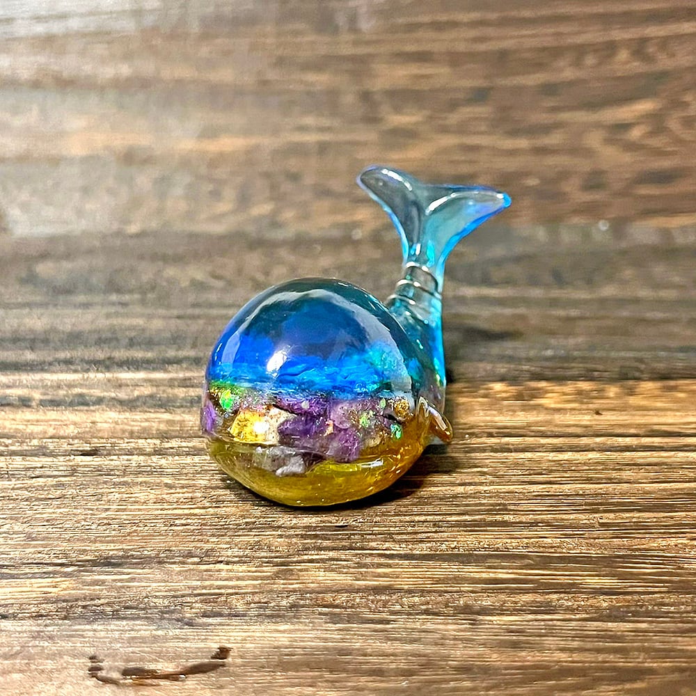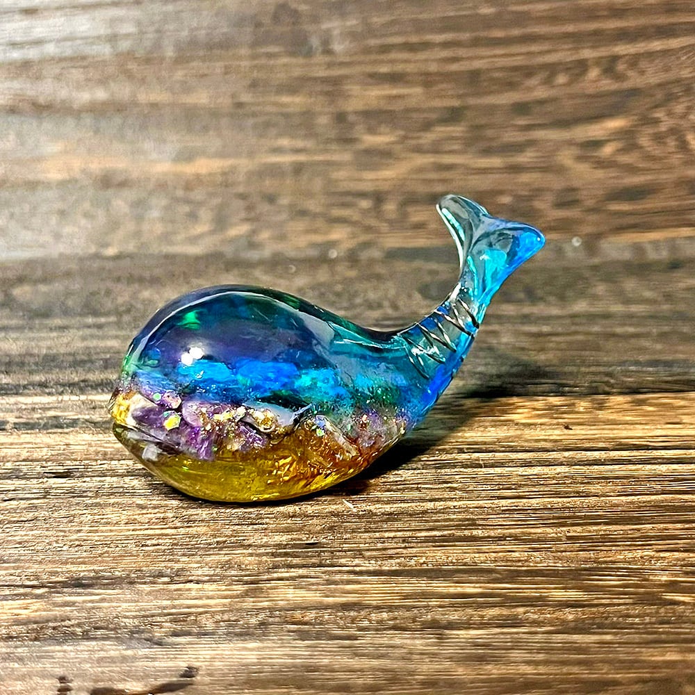 神秘的で可愛いクジラのオルゴナイト。天然石やラメを使って、美しく神秘的でファンタジーな深海の世界に仕上げました。