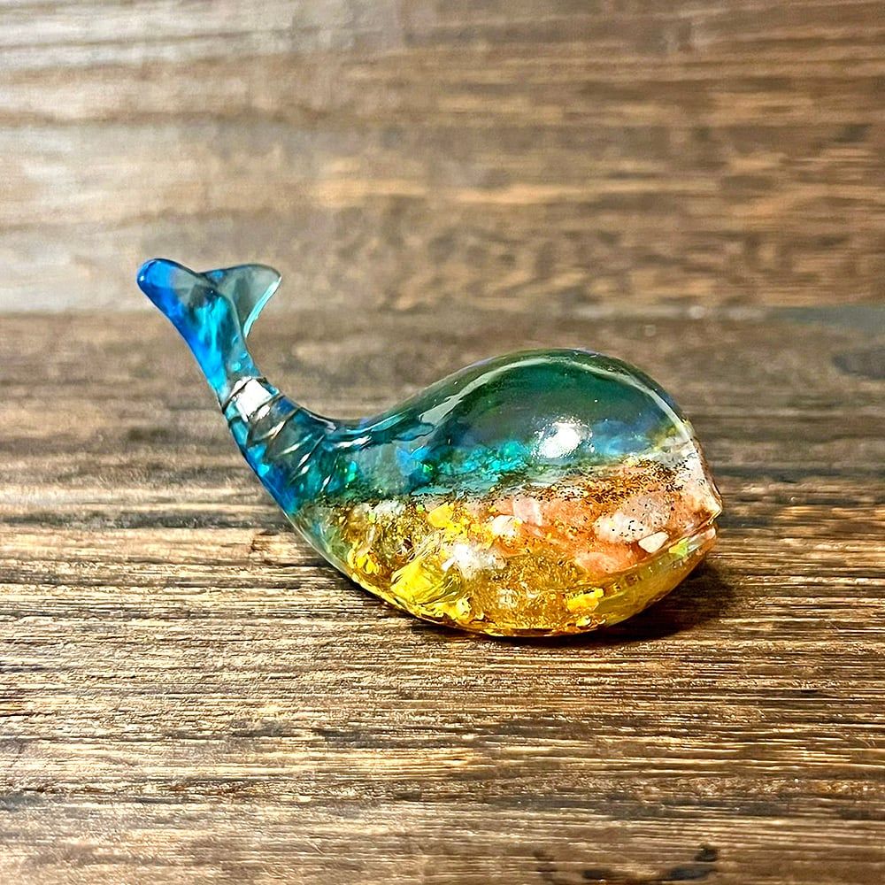 神秘的で可愛いクジラのオルゴナイト。天然石やラメを使って、美しく神秘的でファンタジーな深海の世界に仕上げました。