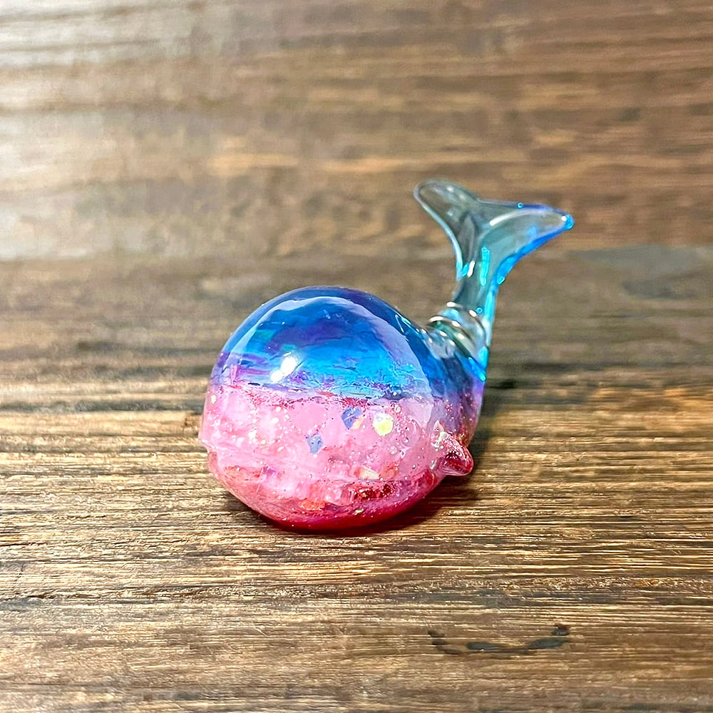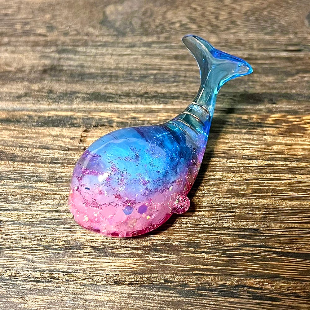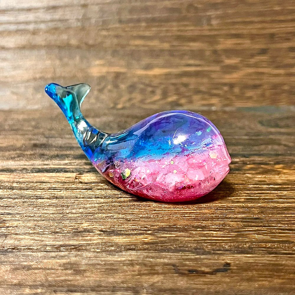 神秘的で可愛いクジラのオルゴナイト。天然石やラメを使って、美しく神秘的でファンタジーな深海の世界に仕上げました。