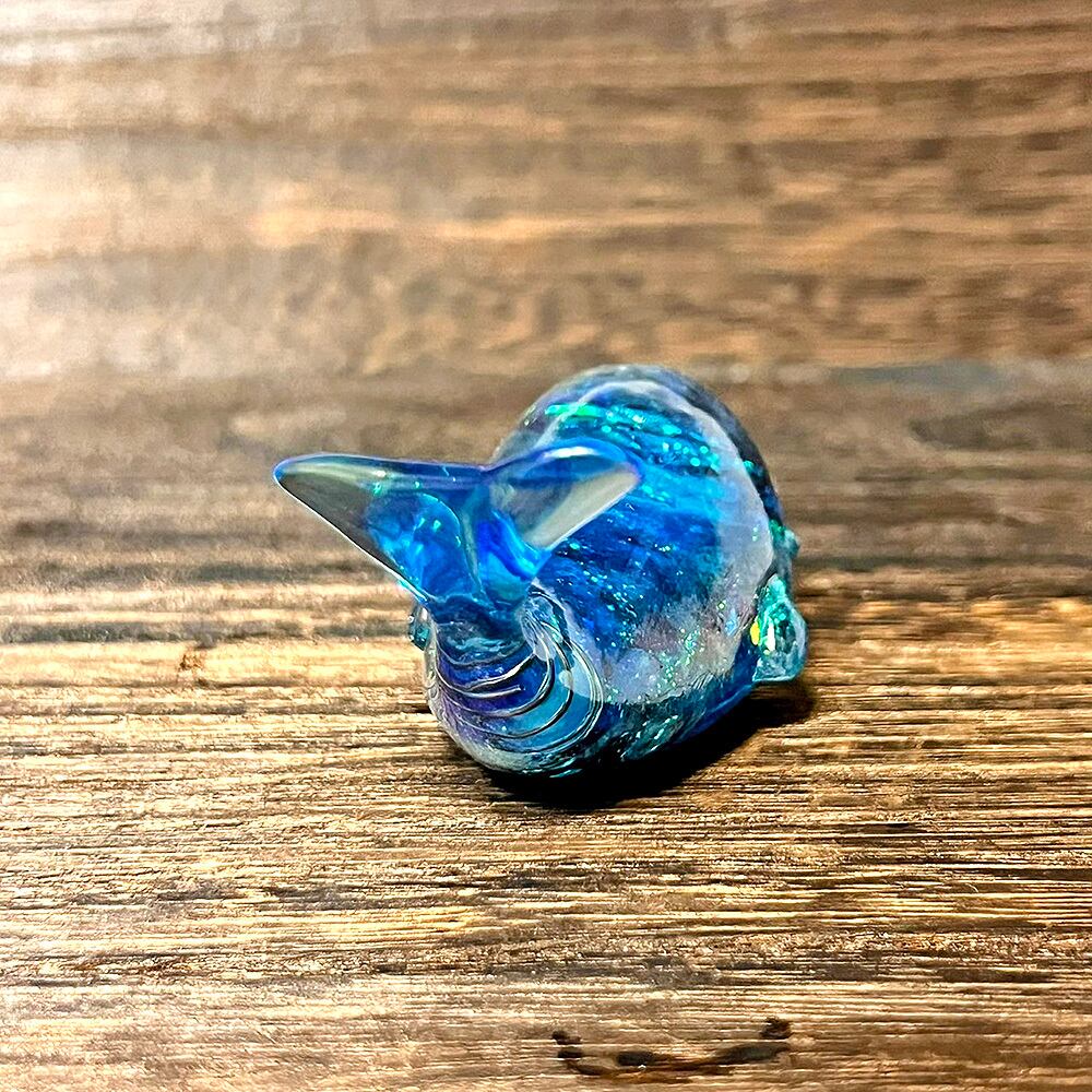 一点一点、天然石の配置やレジンに閉じ込めた素材などが異なり、世界に一つだけの作品です。深海の神秘を表現するため、青を基調としつつも、天然石の色や光によって様々な表情を見せます。まるで海中を泳ぐクジラが、その時々で違う表情を見せてくれるように。