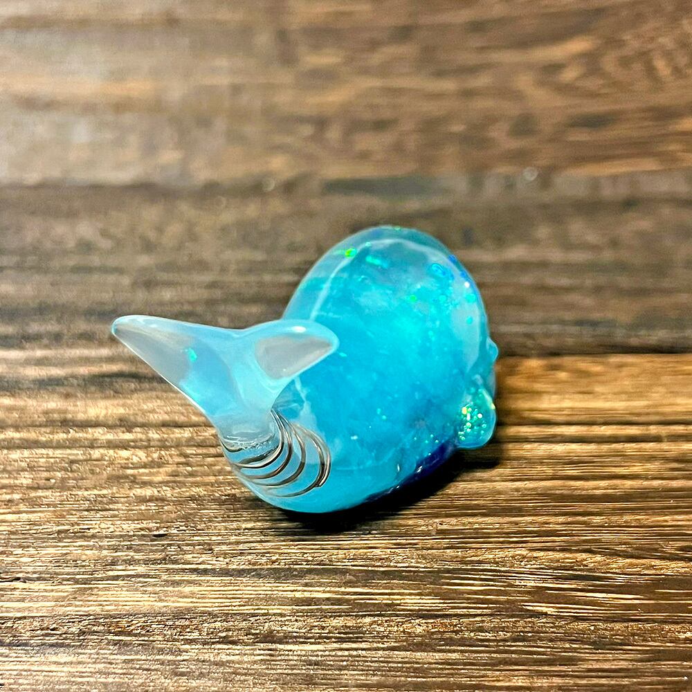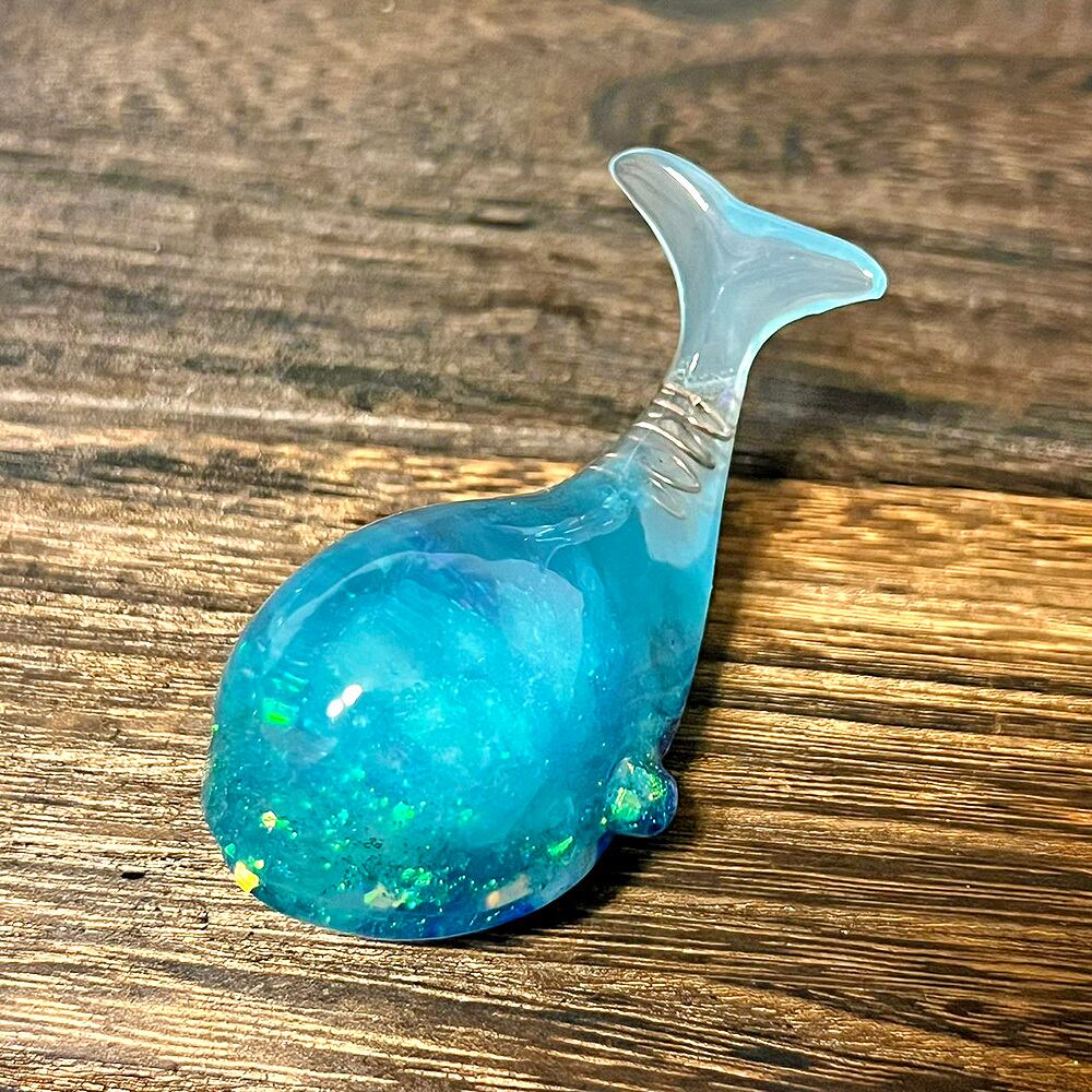 神秘的で可愛いクジラのオルゴナイト。天然石やラメを使って、美しく神秘的でファンタジーな深海の世界に仕上げました。また蓄光素材を入れておりますので、光(太陽光推奨)を当てておくと、暗いところで光ります。