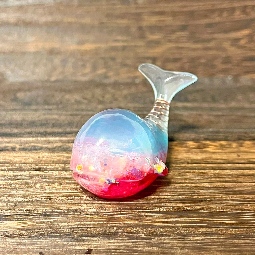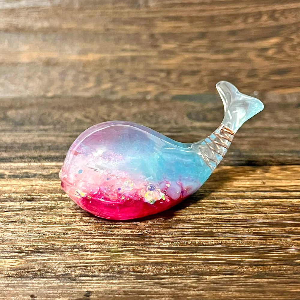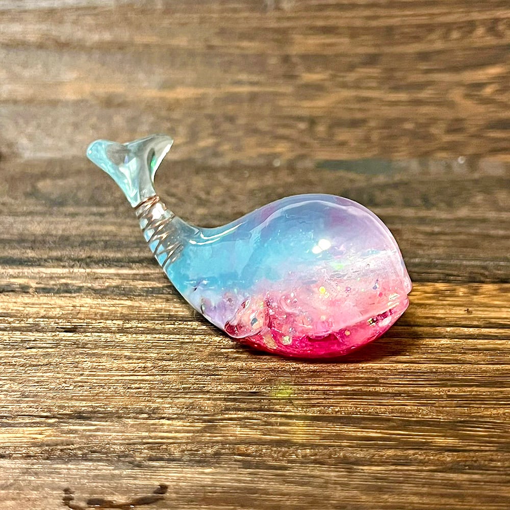 神秘的で可愛いクジラのオルゴナイト。天然石やラメを使って、美しく神秘的でファンタジーな深海の世界に仕上げました。また蓄光素材を入れておりますので、光(太陽光推奨)を当てておくと、暗いところで光ります。
