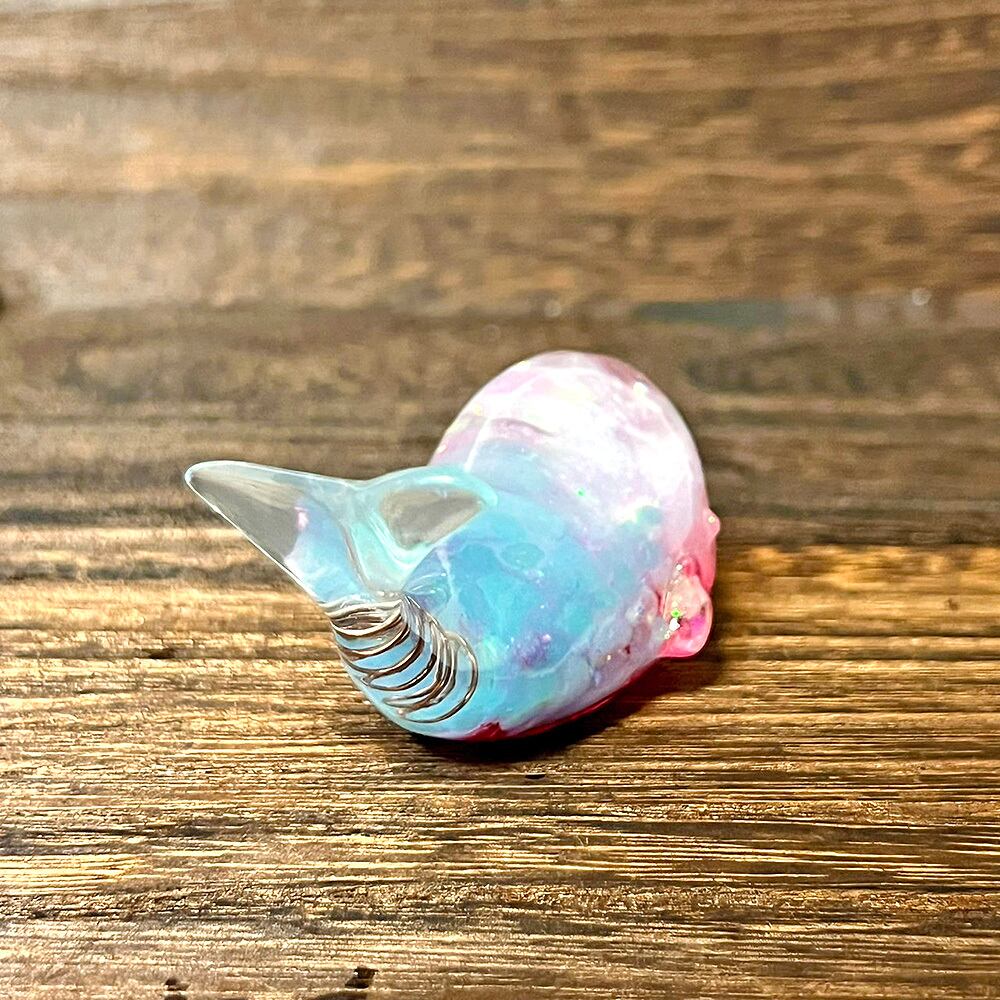 一点一点、天然石の配置やレジンに閉じ込めた素材などが異なり、世界に一つだけの作品です。深海の神秘を表現するため、青を基調としつつも、天然石の色や光によって様々な表情を見せます。まるで海中を泳ぐクジラが、その時々で違う表情を見せてくれるように。