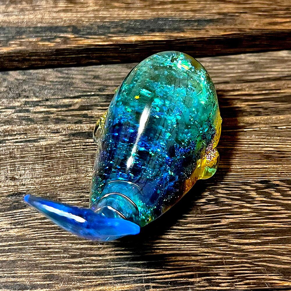 一点一点、天然石の配置やレジンに閉じ込めた素材などが異なり、世界に一つだけの作品です。深海の神秘を表現するため、青を基調としつつも、天然石の色や光によって様々な表情を見せます。まるで海中を泳ぐクジラが、その時々で違う表情を見せてくれるように。